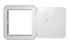 Vermin door accepts both 30 and 50 Amp cord. Open back for a variety of uses. Direct OEM replacement. Resistant to road salts and acids. Paintable. Polar White. Cutout Dim: 6-7/8" h x 6-3/8" w. Outside Dim: 8-1/2" h x 8" w. Collar Depth: 1-1/8".