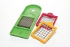 Dice and slice chopper gives you the power to cut, dice, slice and chop fruits and vegetables for salads, stir-fries and more! Evenly slice strawberries, mushrooms, eggs and more. This chopper includes three interchangeable blades and a handy cleaning tool. The blade panels and cleaning tool store conveniently in the base container, which also measures two cups of chopped produce. Non skid feet on base keeps chopper in place when using. With the exception of the lid, all parts are dishwasher safe.